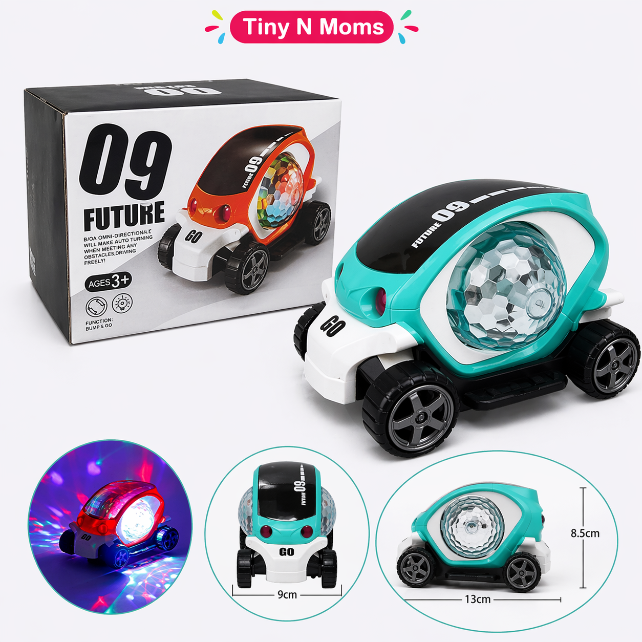 09 Future Car – 360 Degree Rotating with 3D Lights Musical and Flashing Light Sound, Bump and Stunt Action Games Toy for Kids – Pack of 1