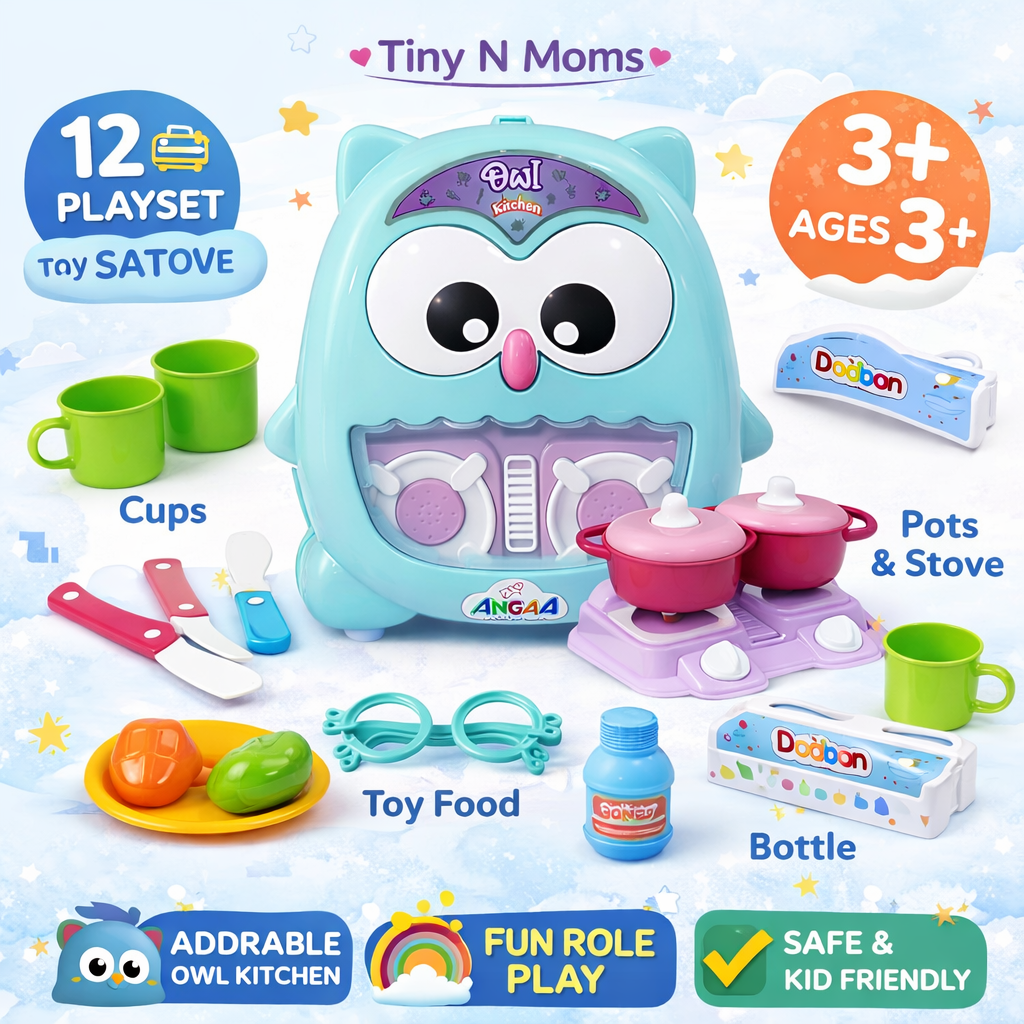 Kids Kitchen Cooking Toy Set with Trolley Suitcase – Cute Owl Design | Pretend Play Cooking Set for Boys & Girls | Educational Role Play Toy Kitchen Kit for Kids | Portable Travel Kitchen Set